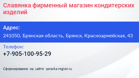 Славянка, фирменный магазин кондитерских изделий по адресу 241050, Брянская область, Брянск, Красноармейская, 43 в дальнейшем Организация, размещена в следующих категориях: