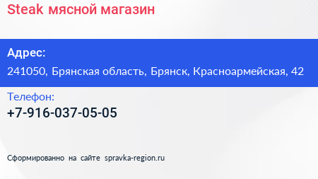 Steak, мясной магазин по адресу 241050, Брянская область, Брянск, Красноармейская, 42 в дальнейшем Организация, размещена в следующих категориях: