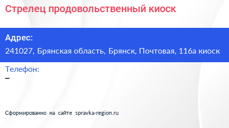 Стрелец, продовольственный киоск по адресу 241027, Брянская область, Брянск, Почтовая, 116а киоск в дальнейшем Организация, размещена в следующих категориях: