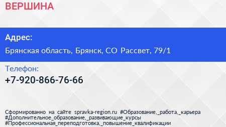 ВЕРШИНА по адресу Брянская область, Брянск, СО Рассвет, 79/1 в дальнейшем Организация, размещена в следующих категориях: