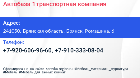 Автобаза №1, транспортная компания по адресу 241050, Брянская область, Брянск, Ромашина, 6 в дальнейшем Организация, размещена в следующих категориях: