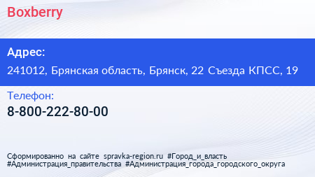 Boxberry по адресу 241012, Брянская область, Брянск, 22 Съезда КПСС, 19 в дальнейшем Организация, размещена в следующих категориях: