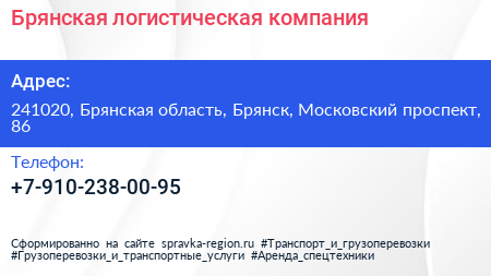 Брянская логистическая компания по адресу 241020, Брянская область, Брянск, Московский проспект, 86 в дальнейшем Организация, размещена в следующих категориях: