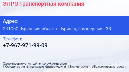 ЭЛРО, транспортная компания по адресу 241050, Брянская область, Брянск, Пионерская, 33 в дальнейшем Организация, размещена в следующих категориях: