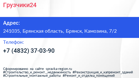 Грузчики24 по адресу 241035, Брянская область, Брянск, Камозина, 7/2 в дальнейшем Организация, размещена в следующих категориях:
