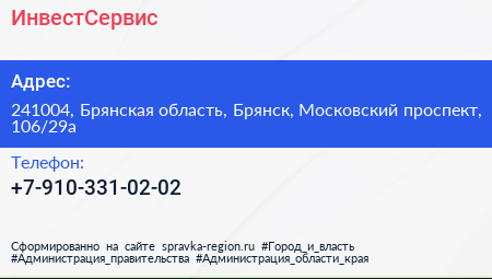 ИнвестСервис по адресу 241004, Брянская область, Брянск, Московский проспект, 106/29а в дальнейшем Организация, размещена в следующих категориях: