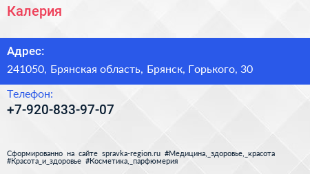 Калерия по адресу 241050, Брянская область, Брянск, Горького, 30 в дальнейшем Организация, размещена в следующих категориях: