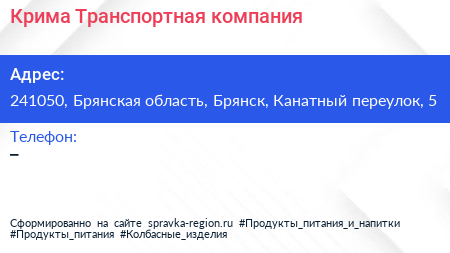 Крима, Транспортная компания по адресу 241050, Брянская область, Брянск, Канатный переулок, 5 в дальнейшем Организация, размещена в следующих категориях:
