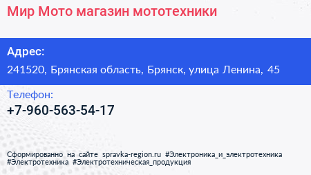Мир-Мото, магазин мототехники по адресу 241520, Брянская область, Брянск, улица Ленина, 45 в дальнейшем Организация, размещена в следующих категориях: