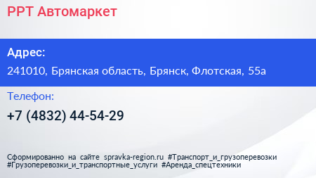 РРТ-Автомаркет по адресу 241010, Брянская область, Брянск, Флотская, 55а в дальнейшем Организация, размещена в следующих категориях: