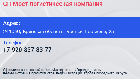СП Мост, логистическая компания по адресу 241050, Брянская область, Брянск, Горького, 2а в дальнейшем Организация, размещена в следующих категориях: