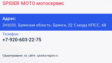 SPIDER-MOTO, мотосервис по адресу 241035, Брянская область, Брянск, 22 Съезда КПСС, 68 в дальнейшем Организация, размещена в следующих категориях: