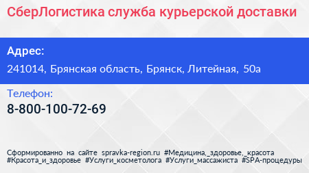 СберЛогистика, служба курьерской доставки по адресу 241014, Брянская область, Брянск, Литейная, 50а в дальнейшем Организация, размещена в следующих категориях: