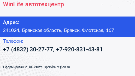 WinLife, автотехцентр по адресу 241024, Брянская область, Брянск, Флотская, 167 в дальнейшем Организация, размещена в следующих категориях: