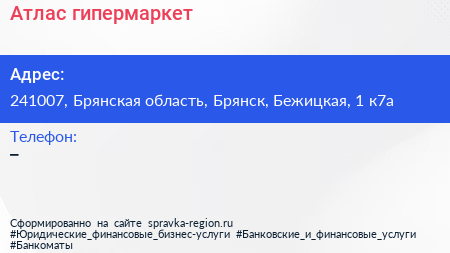 Атлас, гипермаркет по адресу 241007, Брянская область, Брянск, Бежицкая, 1 к7а в дальнейшем Организация, размещена в следующих категориях: