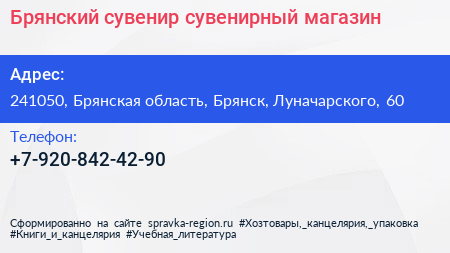 Брянский сувенир, сувенирный магазин по адресу 241050, Брянская область, Брянск, Луначарского, 60 в дальнейшем Организация, размещена в следующих категориях: