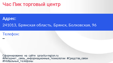 Час Пик, торговый центр по адресу 241013, Брянская область, Брянск, Болховская, 96 в дальнейшем Организация, размещена в следующих категориях: