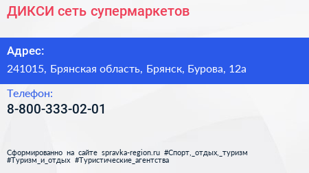 ДИКСИ, сеть супермаркетов по адресу 241015, Брянская область, Брянск, Бурова, 12а в дальнейшем Организация, размещена в следующих категориях: