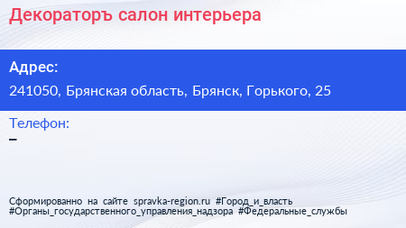 Декораторъ, салон интерьера по адресу 241050, Брянская область, Брянск, Горького, 25 в дальнейшем Организация, размещена в следующих категориях: