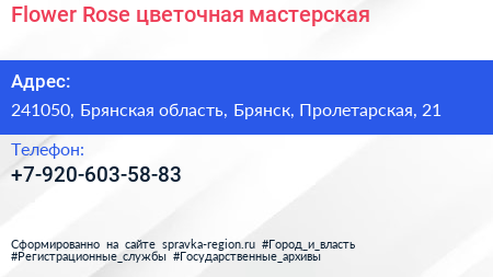 Flower Rose, цветочная мастерская по адресу 241050, Брянская область, Брянск, Пролетарская, 21 в дальнейшем Организация, размещена в следующих категориях: