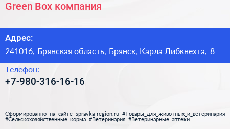 Green Box, компания по адресу 241016, Брянская область, Брянск, Карла Либкнехта, 8 в дальнейшем Организация, размещена в следующих категориях: