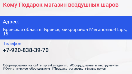 Кому Подарок, магазин воздушных шаров по адресу Брянская область, Брянск, микрорайон Мегаполис-Парк, 15 в дальнейшем Организация, размещена в следующих категориях: