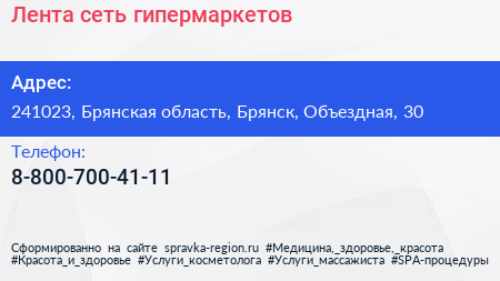 Лента, сеть гипермаркетов по адресу 241023, Брянская область, Брянск, Объездная, 30 в дальнейшем Организация, размещена в следующих категориях: