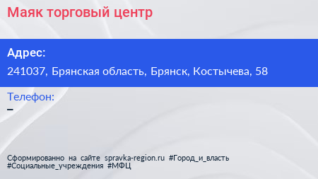 Маяк, торговый центр по адресу 241037, Брянская область, Брянск, Костычева, 58 в дальнейшем Организация, размещена в следующих категориях: