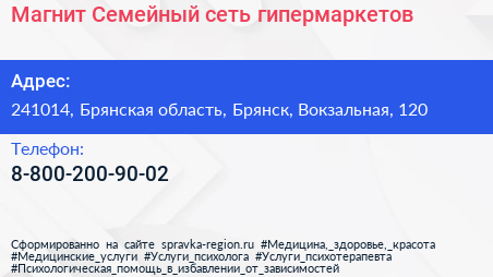 Магнит Семейный, сеть гипермаркетов по адресу 241014, Брянская область, Брянск, Вокзальная, 120 в дальнейшем Организация, размещена в следующих категориях: