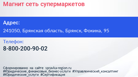 Магнит, сеть супермаркетов по адресу 241050, Брянская область, Брянск, Фокина, 95 в дальнейшем Организация, размещена в следующих категориях: