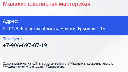 Малахит, ювелирная мастерская по адресу 241029, Брянская область, Брянск, Ермакова, 1Б в дальнейшем Организация, размещена в следующих категориях: