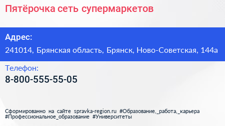 Пятёрочка, сеть супермаркетов по адресу 241014, Брянская область, Брянск, Ново-Советская, 144а в дальнейшем Организация, размещена в следующих категориях: