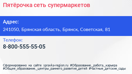 Пятёрочка, сеть супермаркетов по адресу 241050, Брянская область, Брянск, Советская, 81 в дальнейшем Организация, размещена в следующих категориях:
