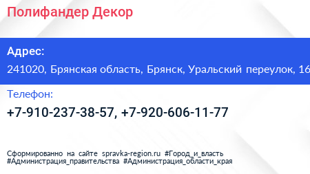 Полифандер Декор по адресу 241020, Брянская область, Брянск, Уральский переулок, 16 в дальнейшем Организация, размещена в следующих категориях: