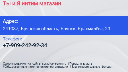 Ты и Я, интим-магазин по адресу 241037, Брянская область, Брянск, Крахмалёва, 23 в дальнейшем Организация, размещена в следующих категориях: