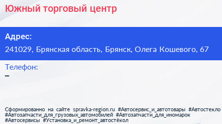 Южный, торговый центр по адресу 241029, Брянская область, Брянск, Олега Кошевого, 67 в дальнейшем Организация, размещена в следующих категориях: