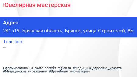 Ювелирная мастерская по адресу 241519, Брянская область, Брянск, улица Строителей, 8Б в дальнейшем Организация, размещена в следующих категориях: