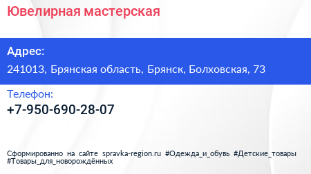 Ювелирная мастерская по адресу 241013, Брянская область, Брянск, Болховская, 73 в дальнейшем Организация, размещена в следующих категориях:
