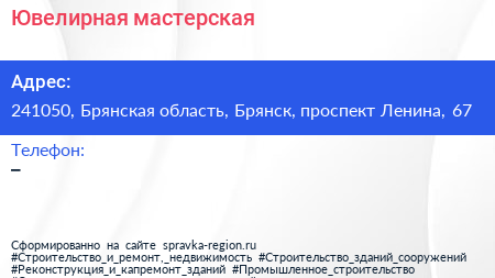 Ювелирная мастерская по адресу 241050, Брянская область, Брянск, проспект Ленина, 67 в дальнейшем Организация, размещена в следующих категориях:
