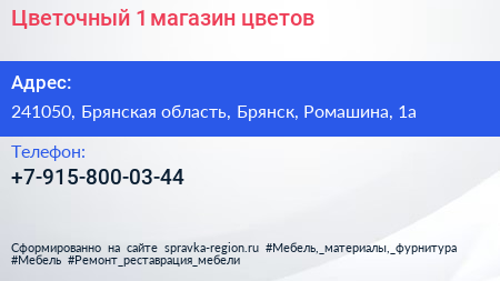 Цветочный №1, магазин цветов по адресу 241050, Брянская область, Брянск, Ромашина, 1а в дальнейшем Организация, размещена в следующих категориях: