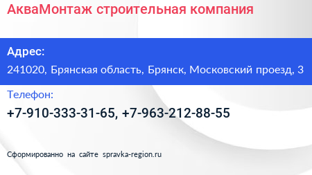 АкваМонтаж, строительная компания по адресу 241020, Брянская область, Брянск, Московский проезд, 3 в дальнейшем Организация, размещена в следующих категориях: