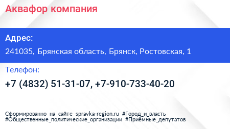 Аквафор, компания по адресу 241035, Брянская область, Брянск, Ростовская, 1 в дальнейшем Организация, размещена в следующих категориях: