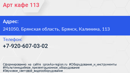 Арт-кафе 113 по адресу 241050, Брянская область, Брянск, Калинина, 113 в дальнейшем Организация, размещена в следующих категориях: