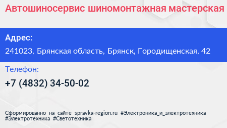 Автошиносервис, шиномонтажная мастерская по адресу 241023, Брянская область, Брянск, Городищенская, 42 в дальнейшем Организация, размещена в следующих категориях: