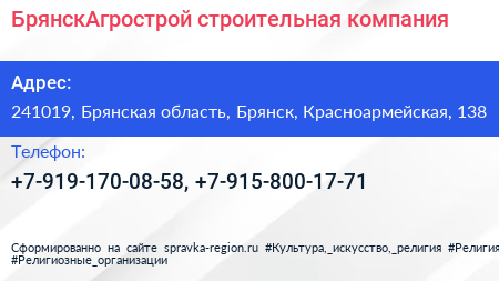 БрянскАгрострой, строительная компания по адресу 241019, Брянская область, Брянск, Красноармейская, 138 в дальнейшем Организация, размещена в следующих категориях: