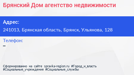 Брянский Дом, агентство недвижимости по адресу 241013, Брянская область, Брянск, Ульянова, 128 в дальнейшем Организация, размещена в следующих категориях: