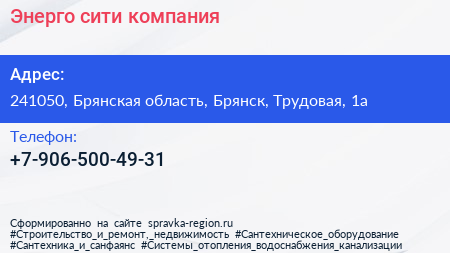 Энерго-сити, компания по адресу 241050, Брянская область, Брянск, Трудовая, 1а в дальнейшем Организация, размещена в следующих категориях: