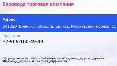 Евровода, торговая компания по адресу 241020, Брянская область, Брянск, Московский проезд, 10 в дальнейшем Организация, размещена в следующих категориях: