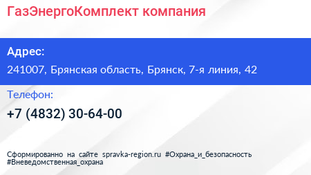 ГазЭнергоКомплект, компания по адресу 241007, Брянская область, Брянск, 7-я линия, 42 в дальнейшем Организация, размещена в следующих категориях: