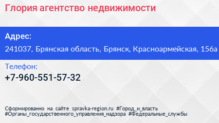 Глория, агентство недвижимости по адресу 241037, Брянская область, Брянск, Красноармейская, 156а в дальнейшем Организация, размещена в следующих категориях: